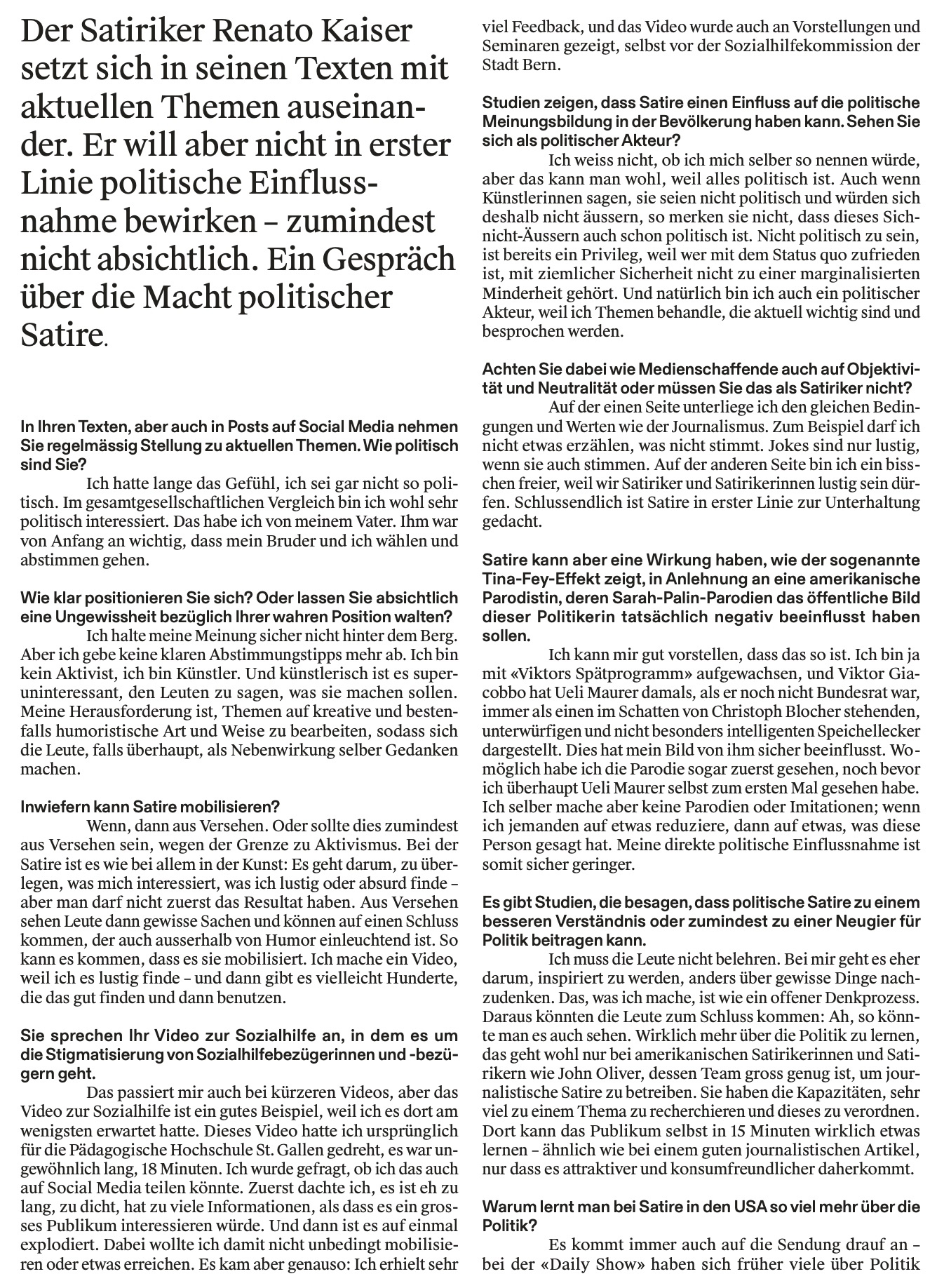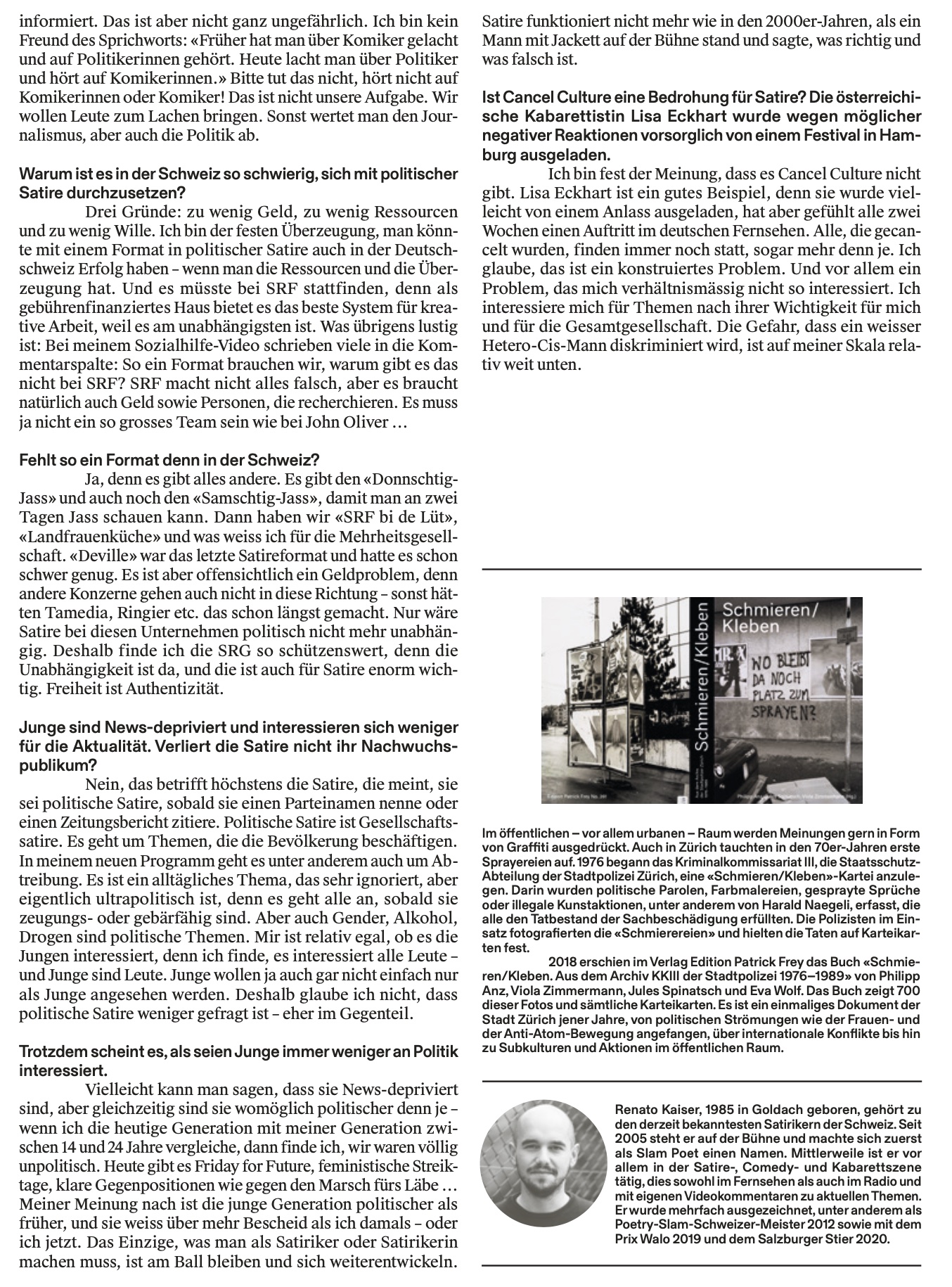 Warum bin ich kein Freund dieses Sprichworts? Wie politisch bin ich? Inwiefern kann Satire mobilisieren? Wie neutral kann sie sein? Ist Cancel Culture eine Bedrohung für Satire? Und verliert sie ihr Nachwuchspublikum?